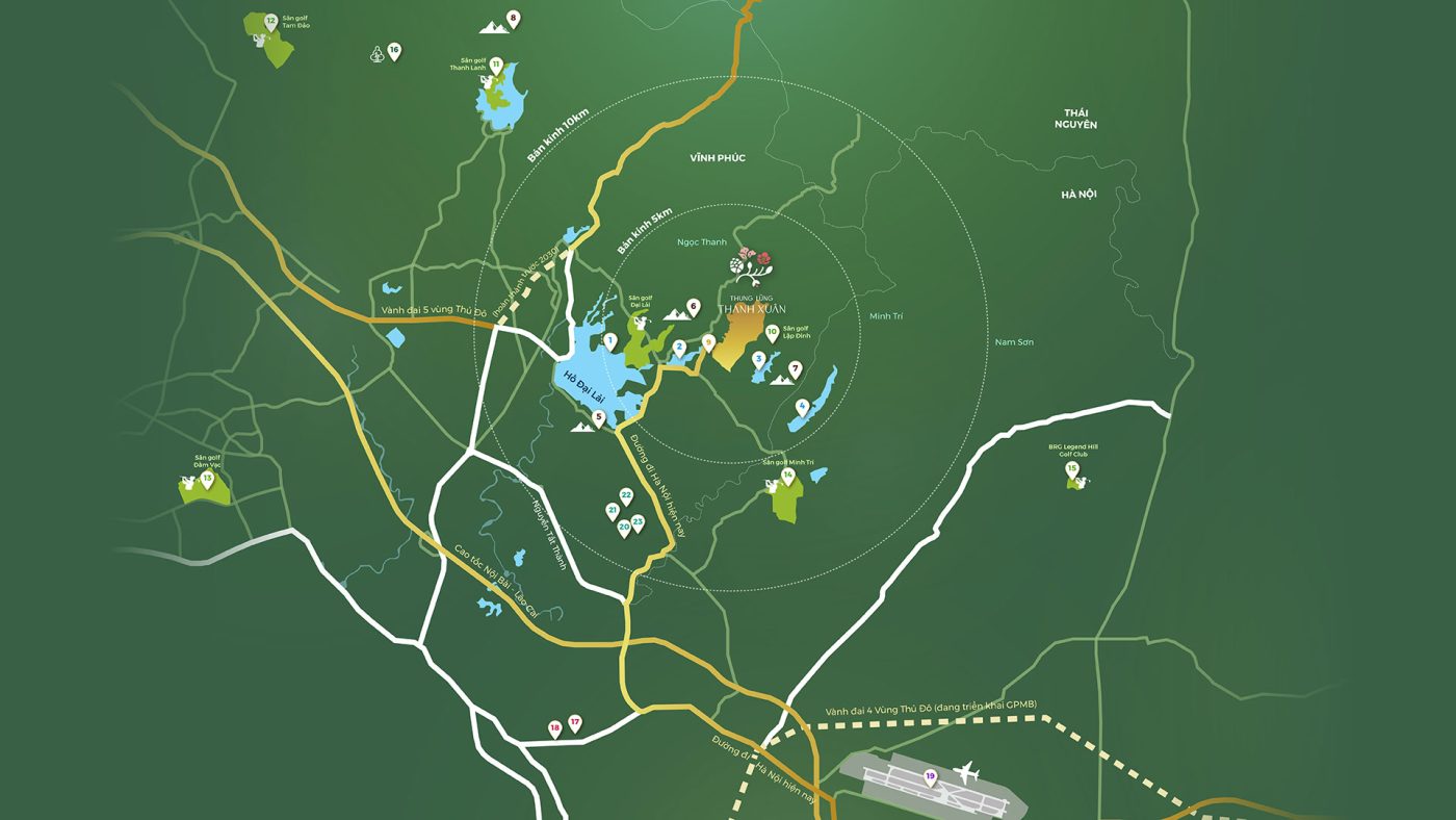 Dự án Thung Lũng Thanh Xuân có tổng diện tích gần 170ha kế bên hồ Đại Lải vơi hơn 1000 sản phẩm biệt thự, liền kề, shophouse được chia làm 5 phân khu chính theo 5 chủ đề khác nhau là:
